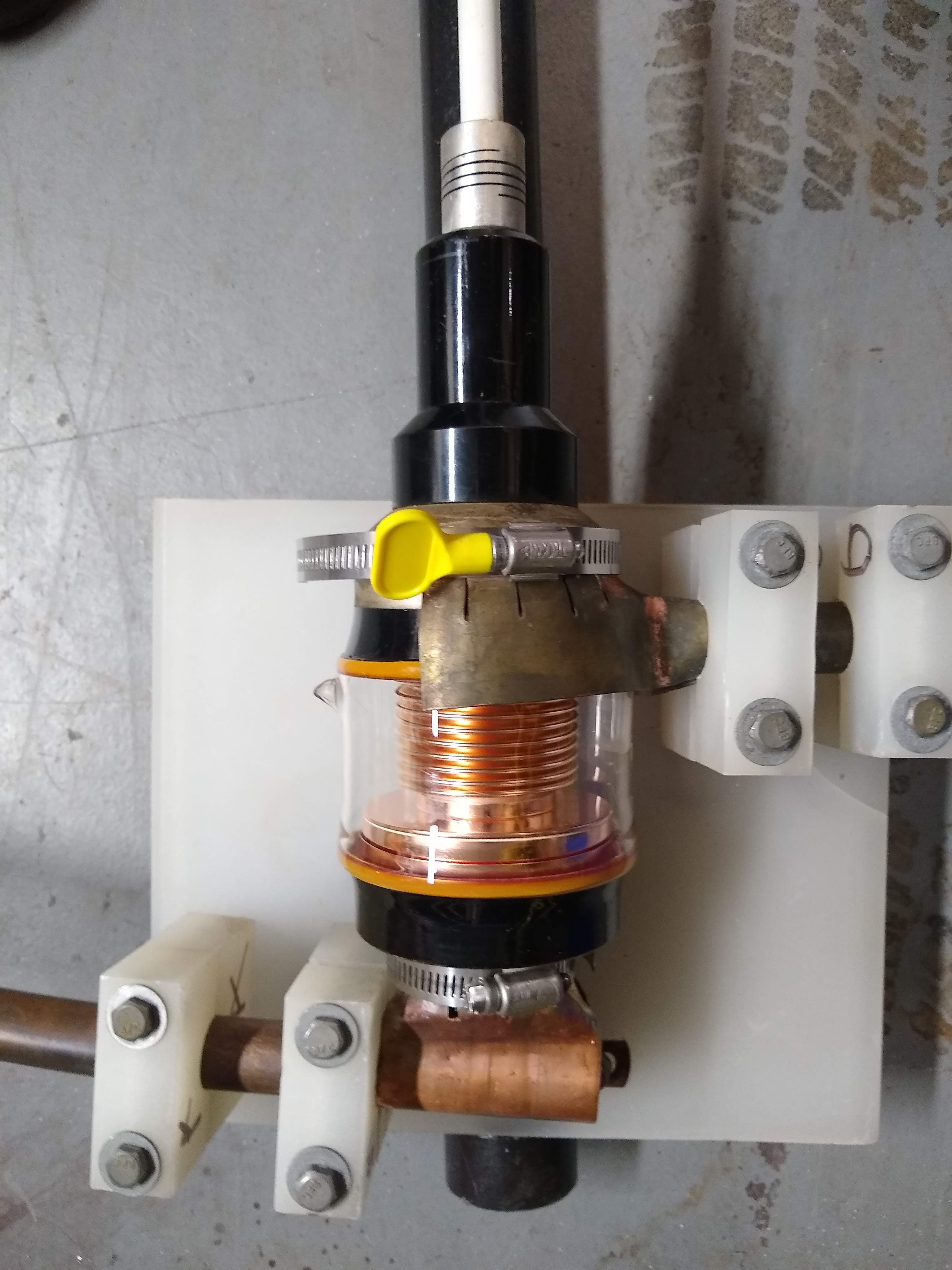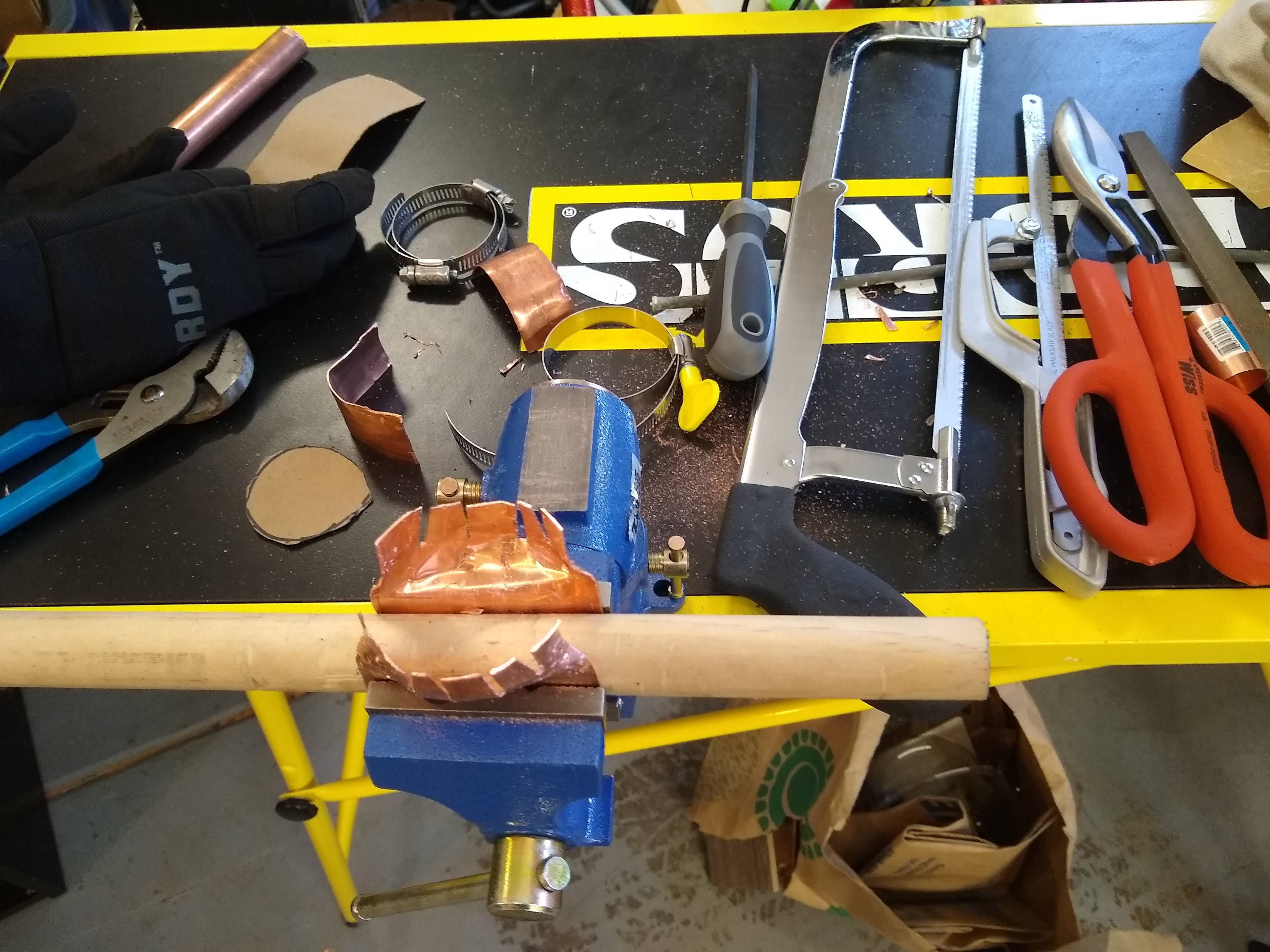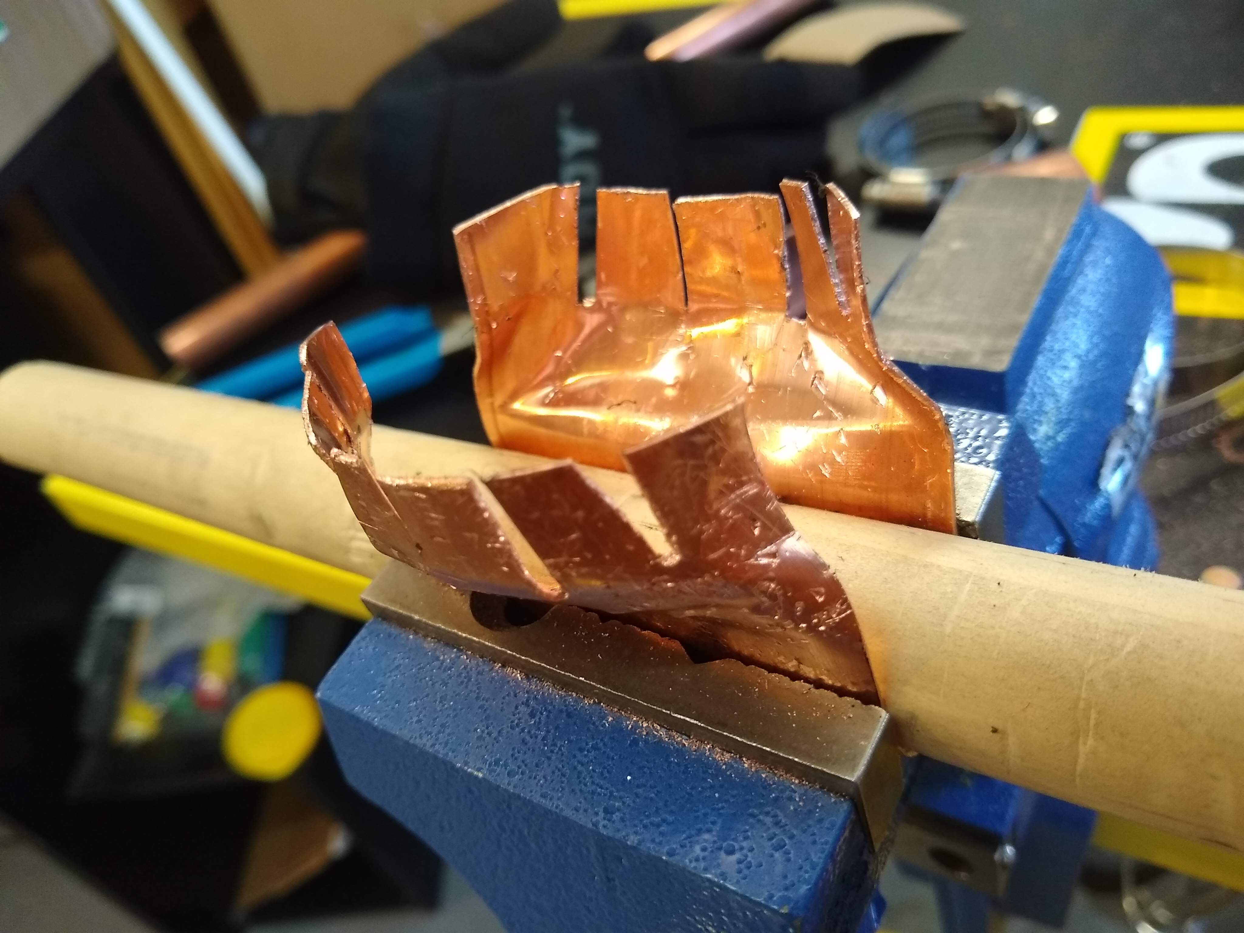The next challenge was to find a way to fit my vacuum variable capacitor to it since they are different sizes. My design goal was to find a single copper piece replacement for the 90 degree fitting in order to minimize resistive losses and so that I didn't have to re-drill any holes. This part took the longest, as I had to think a bit about what I wanted, and then it took some extra time to fabricate it using hande tools. But I am pleased to say it worked out!