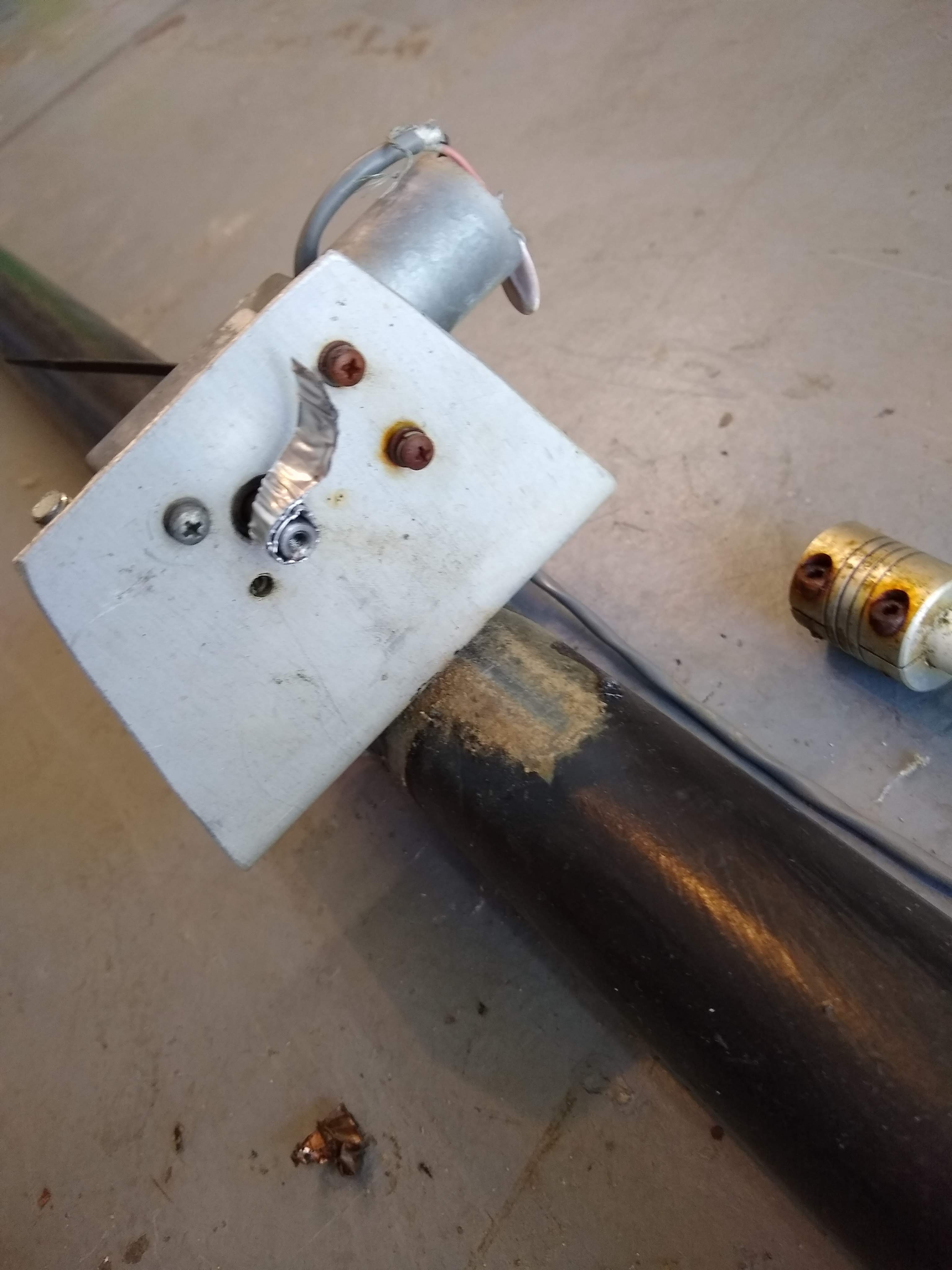 To couple the motor shaft to the fiberglass drive shaft I use made a "bushing" out of an aluminum pie pan.